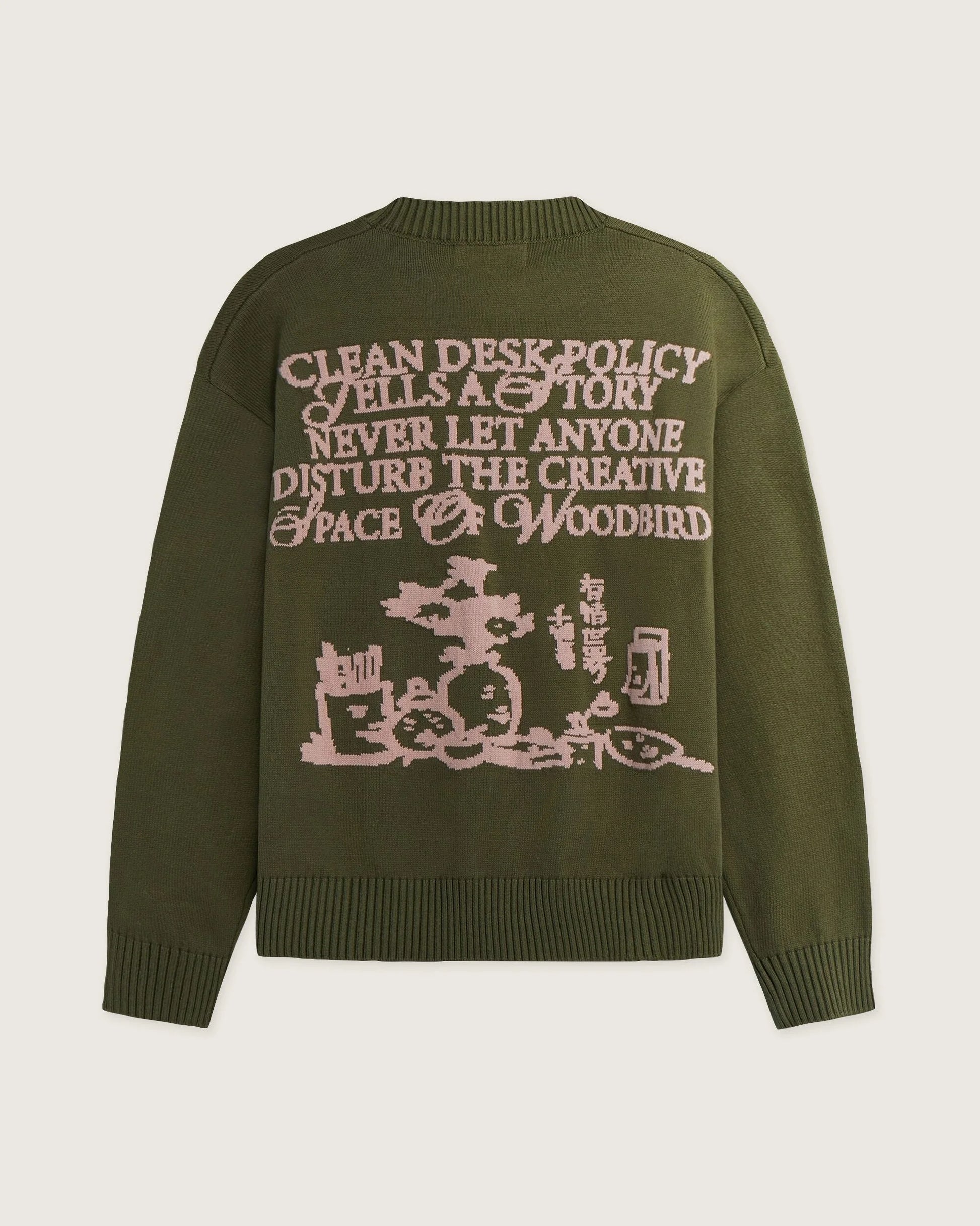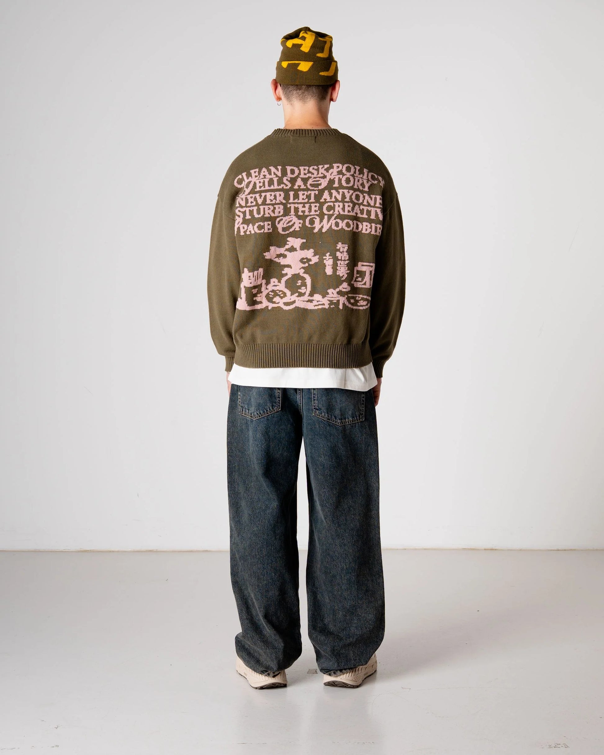 From the front, it’s a clean-cut crewneck with solid structure. Turn around, and the back hits with bold lettering and art that makes it clear: creativity comes with chaos... And a great sweater.