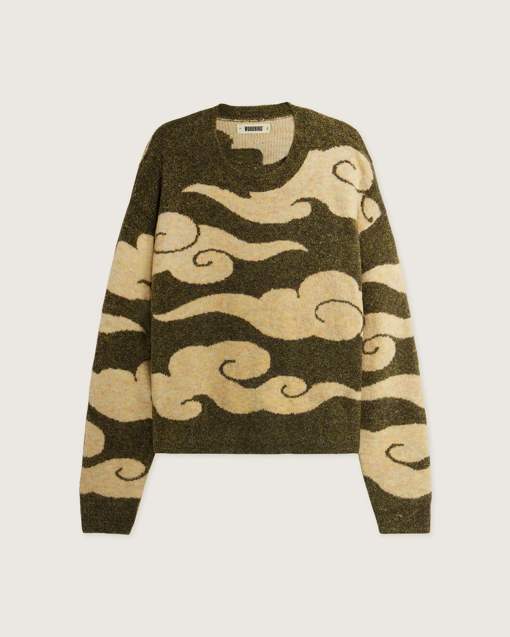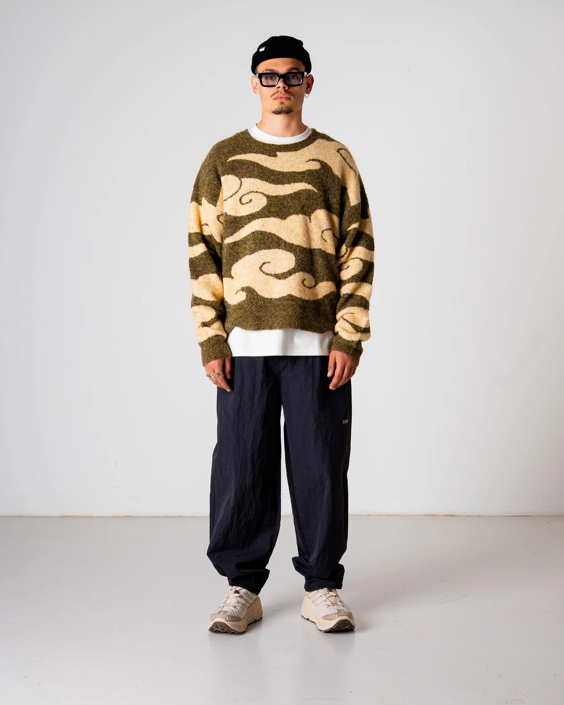 This sweater brings the drama with sweeping wave-like patterns that move across a soft, brushed knit. It’s bold, fluid, and slightly surreal - like wearing a daydream in sweater form.